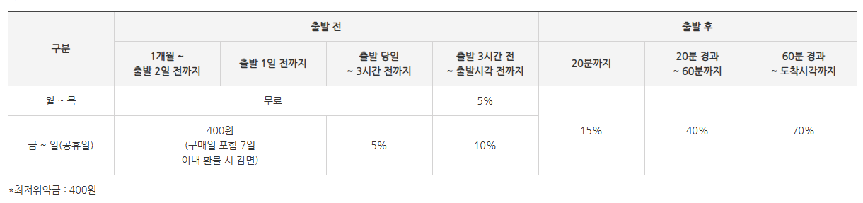 - 출발 전 (주말/공휴일): 주말 및 공휴일은 평일과 조금 다릅니다. 구매일 포함 7일 이내 취소 시 400원, 7일 이후에는 10%의 수수료가 발생합니다. 단돈 400원이라도 아끼려면 빠른 결정이 중요합니다!