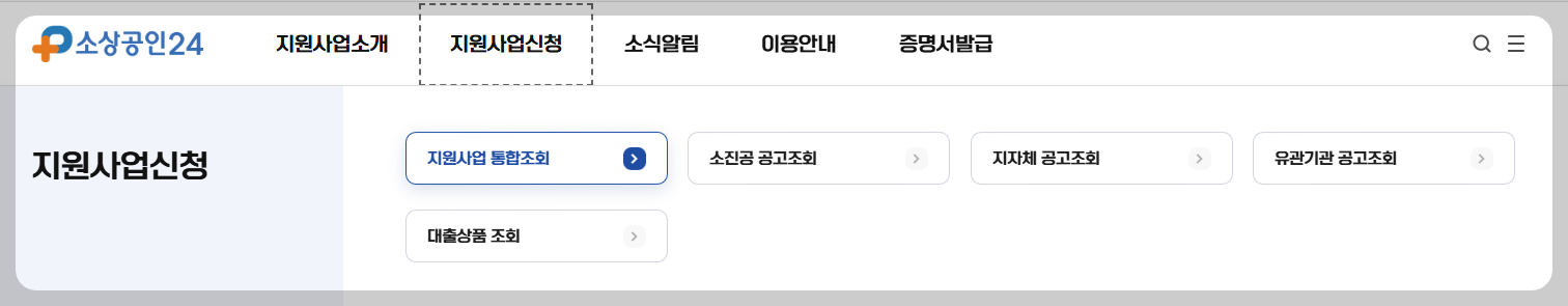 ① 메인 페이지 → 상단 메뉴 ‘지원사업신청’ 클릭 →'지원사업 통합조회' 클릭